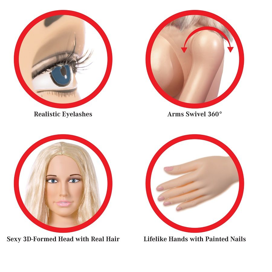 Esta incrível boneca do amor inflável em tamanho real foi meticulosamente projetada com recursos realistas para uma experiência verdadeiramente realista. Sua cabeça formada em 3D sexy apresenta cílios realistas e uma luxuosa cabeça de cabelo real que está implorando para ser puxado! Observe-a realmente ganhar vida com braços que giram 360 graus e unhas e dedos das mãos maravilhosamente pintadas. Dê um aperto em seus seios firmes e empinados enquanto desfruta de sua pele, buceta e bunda ultra-realistas Fanta-Flesh ? que são ainda melhores do que a real! A buceta e a bunda Fanta-Flesh ? são removíveis para uma limpeza mais fácil e profunda e podem ser saboreadas separadamente para a masturbação. Uma bomba de inflação, kit de reparo de vinil e instruções estão convenientemente incluídos.